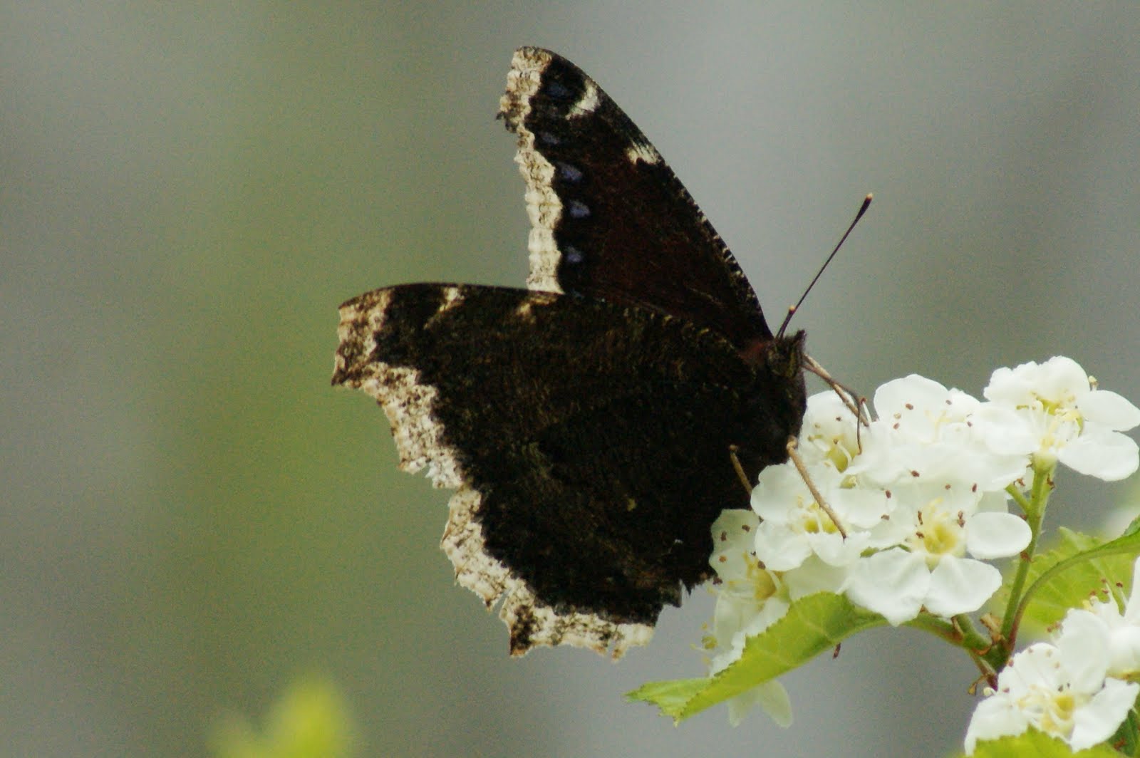 Walking back up the road, I spied a mourning cloak, drinking nectar from a Northern hawthorn bush...
